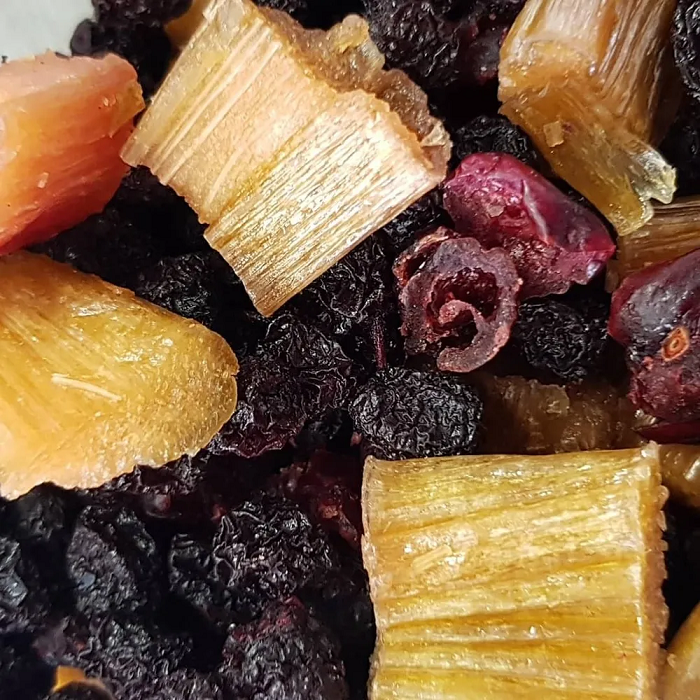 Свежие стебли дикорастущего ревеня, порезанные и вываренные в сахарном сиропе при температуре не выше 70 градусов с добавлением вяленой клюквы и черноплодной рябины. Пластиковый стакан с крышкой, 130 г.
